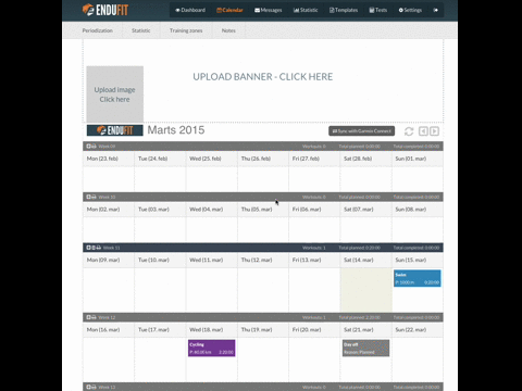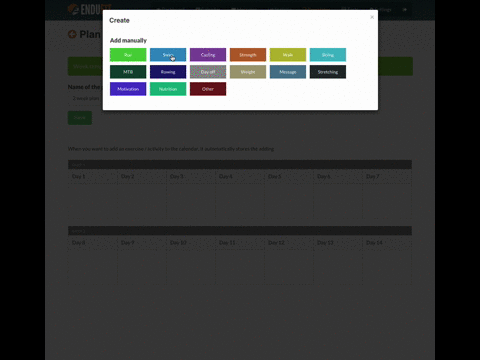 For at oprette en træning skal du klikke på den dato du ønsker træningen skal oprettes til. Derefter vælger du hvilken type aktivitet du vil lave (løb, cykling, svømning etc).